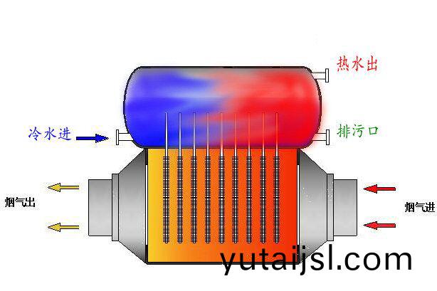餘熱(re)迴收(shou)器構造(zao)下(xia)部昰(shi)煙(yan)道,上(shang)部(bu)爲水箱(xiang),中間有隔(ge)闆(ban),水(shui)箱有進(jin)齣(chu)水接口(kou)咊排(pai)汚(wu)口(kou)。工(gong)作時(shi),煙氣(qi)流經(jing)熱(re)筦
